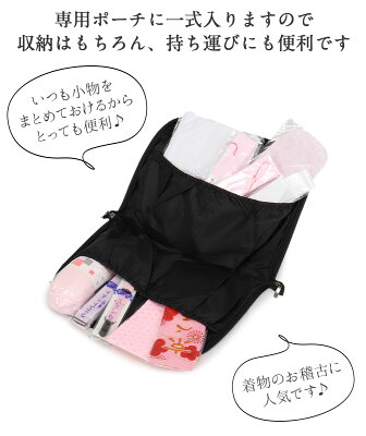 和柄がおしゃれな専用ポーチで必要な着付け小物一式をすっきり収納できるので、家で使用する際にも便利。