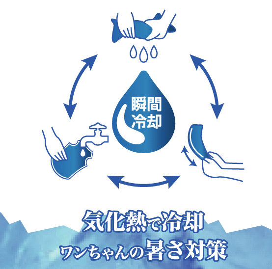 水分を含んだ生地は、被毛との摩擦や外気に触れることで水分が浸透し効果的に気化熱を発生させひんやり冷感が得られます。