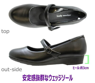 レディワーカー LO17560 黒 3E ゆったり 幅広設計 アシックス商事 パンプス 就活 営業 外回り 疲れない ウェッジソール 立ち仕事 通勤 オフィスシューズ ストラップ付 ヒール 3cm 【靴】レディース(女性)仕事用 Lady worker