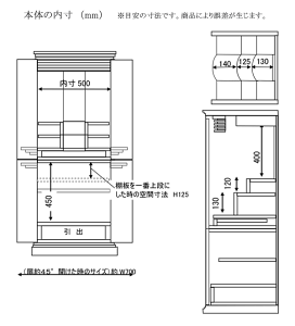 寸法・外寸:W560×D460×H1490(mm)・引出内寸:W318×D260×H40(mm)・膳引き有効面:W435×D230(mm)・可動棚穴ピッチ:40mm4段・可動棚奥行き:D370mm詳細・材質:黒檀、本紫檀、バーロッサ・塗装:ウレタン塗装・日本製・約71kg・収納台棚板1枚可動式 ・引出し付・LEDライト〇梱包数:1 /完成品配送※お仏壇は配送料無料です>>詳しくは配送についてをご覧下さい。