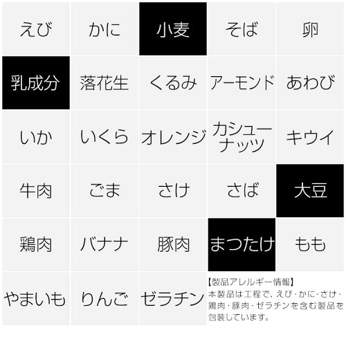 また本製品は工程で乳、えび、かに、牛肉、 鶏肉、豚肉、ゼラチン、まつたけを含む製品を包装しています。